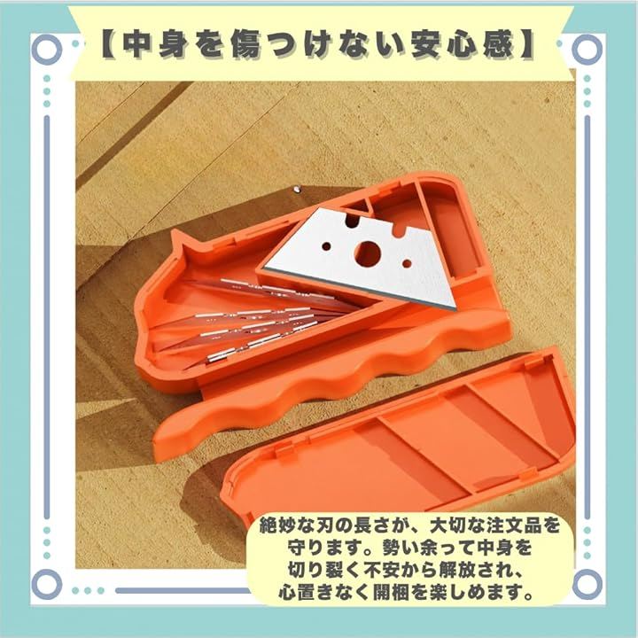 「中身を傷つけない安心感」絶妙な刃の長さが、大切な注文品を守ります。