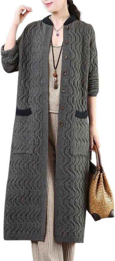 ツートンが印象的なアウターなので、襟のカラーと同系色の長袖トップスやボトムスと合わせるとコーディネートに統一性が出ておしゃれ上級者に。 ロング丈+ケーブルニット風のなみなみとしたデザインが縦ラインで入っていることで細見えし、着やせ効果が期待できるのがうれしいポイントです。