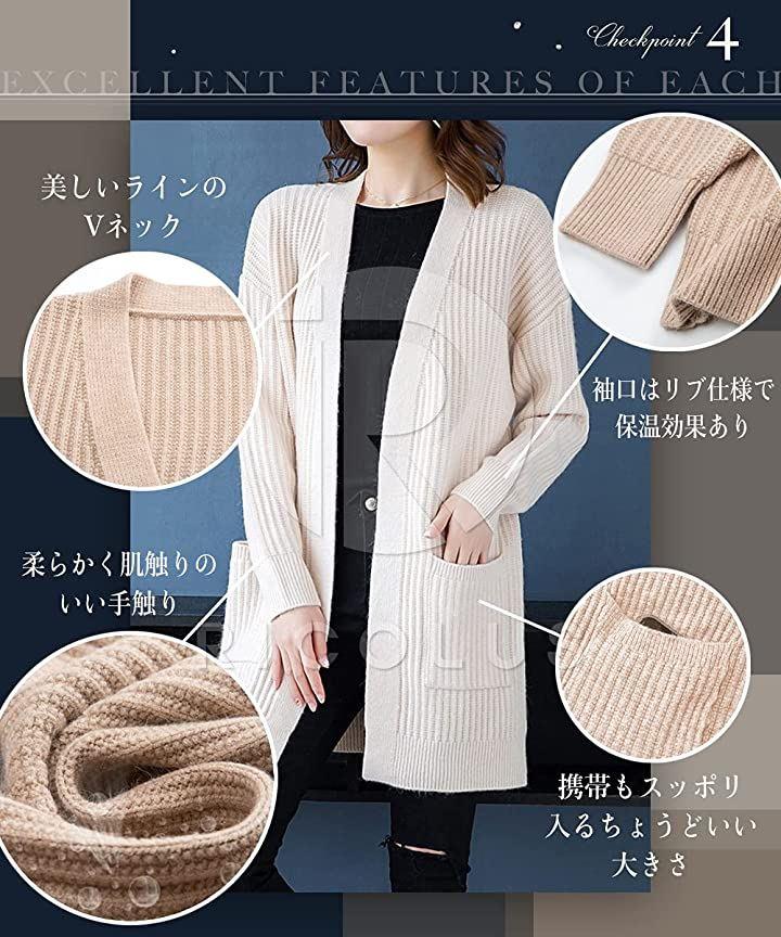 ・シンプルな細めのデザインにボタンレス&縦ラインの編み目で、細く見える効果があり、いつも着たい一枚。