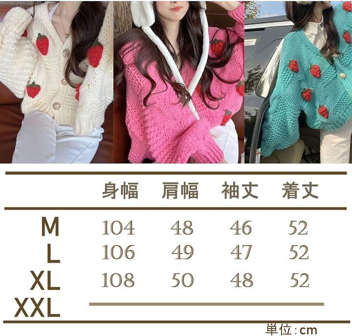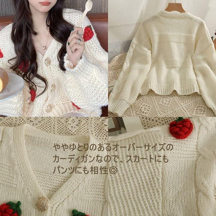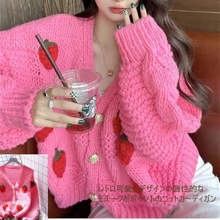 レトロガーリーなライン配色ニットカーディガンで甘くなりすぎないイチゴモチーフが散りばめられたお洒落カーデ。
