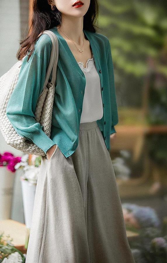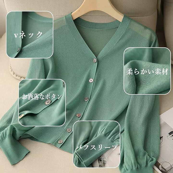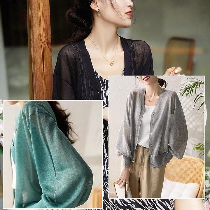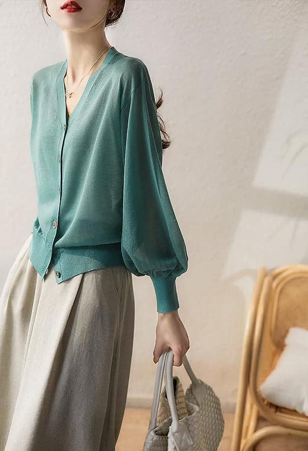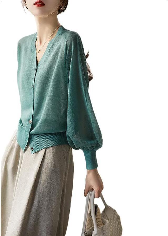 Cardigan, Women's, Thin, Plain, V-Neck, Puff Sleeve, Long Sleeve, Soft Material, Loose, Good Touch, Cooling Protection