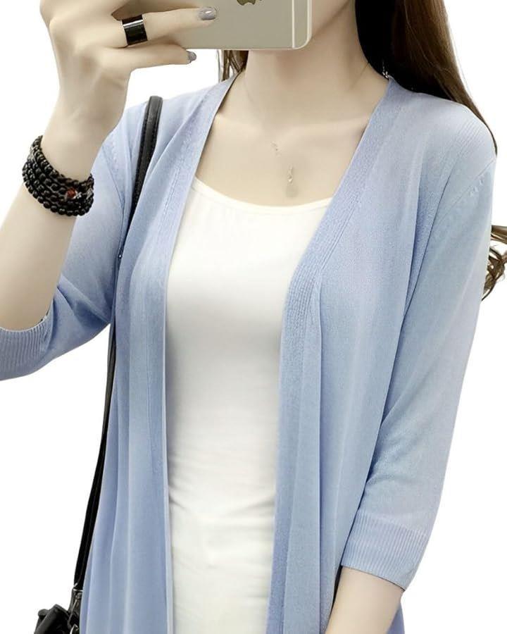 「シンプルカーディガン」 シンプルデザインが落ち着き、さっと羽織るだけで雰囲気のあるコーディネートへ導いてくれるひざ丈のカーディガンです。