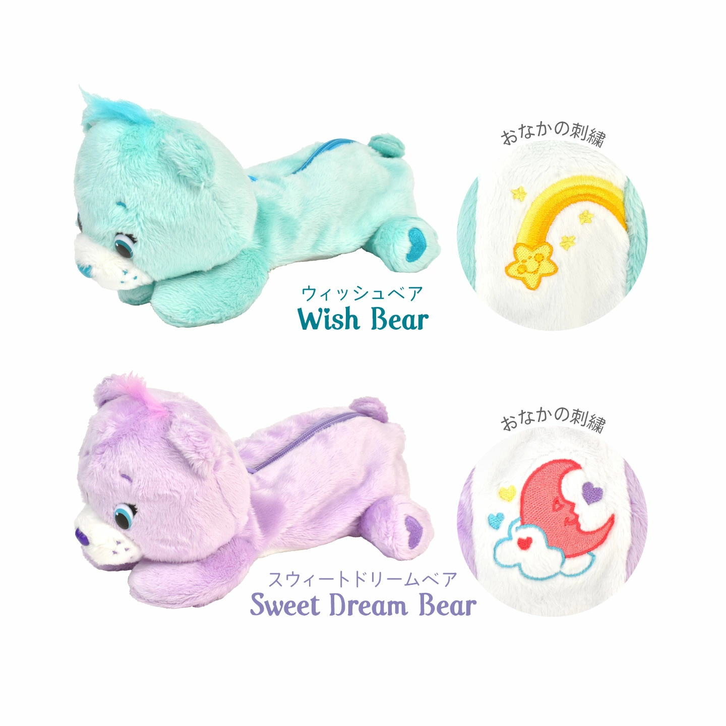 【ロングポーチ】ぬいぐるみペンケースにケアベアが登場!ふわふわな触り心地のぬいぐるみ生地を使用して存在感抜群。おなかにはそれぞれかわいい刺繍が入っています♪15cm定規などの文房具も入るサイズ感で、ペンケースや小物入れにぴったりです。