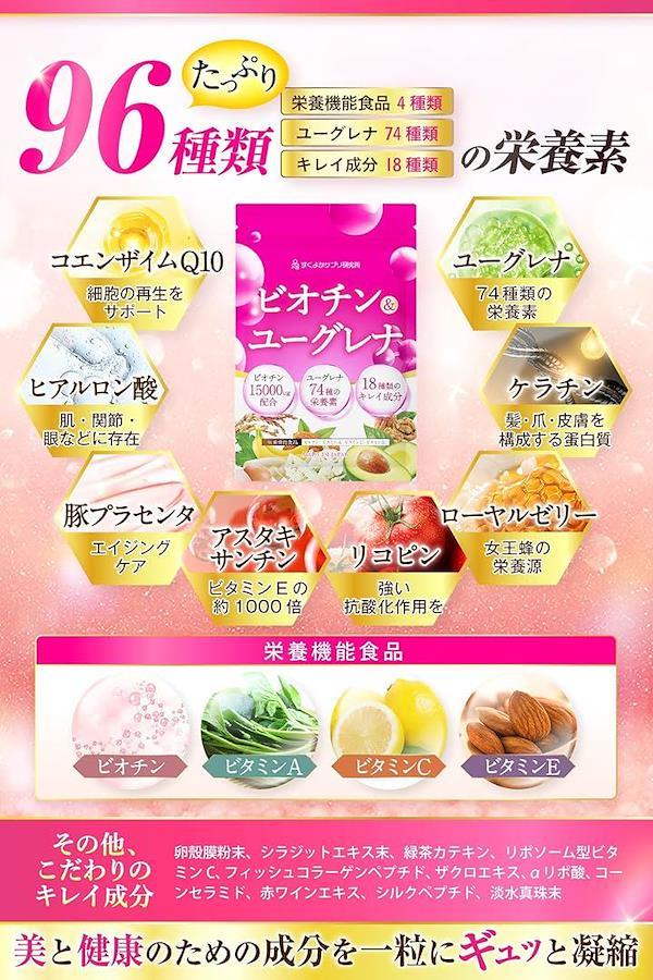 原材料:ビオチン含有酵母(アメリカ製造)、ビタミンE含有植物油、ユーグレナ粉末、ケラチン加水分解物(ケラチン加水分解物、デキストリン)、鶏卵卵殻膜(卵を含む)、ローヤルゼリー末、フィッシュコラーゲンペプチド(ゼラチンを含む)、ザクロエキス末(デキストリン、ザクロ果汁)、豚プラセンタエキス末(豚肉を含む)、αリポ酸、コエンザイムQ10、とうもろこしエキス末(セラミド含有)(デキストリン、とうもろこしエキス)、レスベラトロール含有赤ワインエキス末、シルク加水分解物(シルク加水分解物、デキストリン)、淡水真珠末、精製シラジットエキス末(精製シラジットエキス、デキストリン)、脂肪酸/セルロース、ビタミンC、ステアリン酸カルシウム、微粒酸化ケイ素、加工デンプン、ビタミンA、トマト色素、ヒアルロン酸、チャ抽出物、ヘマトコッカス藻色素、ヒマワリレシチン、酸化防止剤(ビタミンE)、ビタミンP