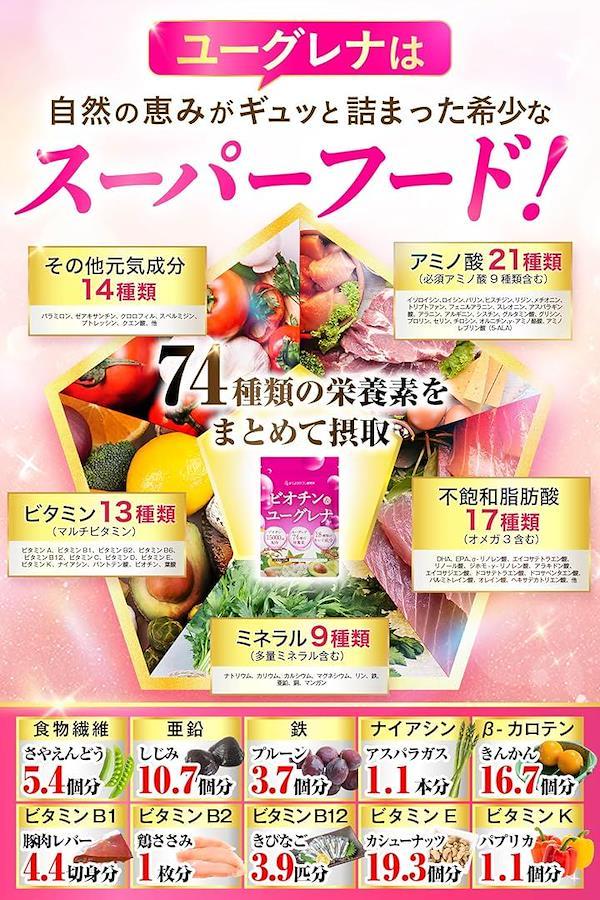 「ビオチン&ユーグレナ」なら、高配合のビオチン(500μg/日)に加え、その他多くの栄養も同時に摂取できます。