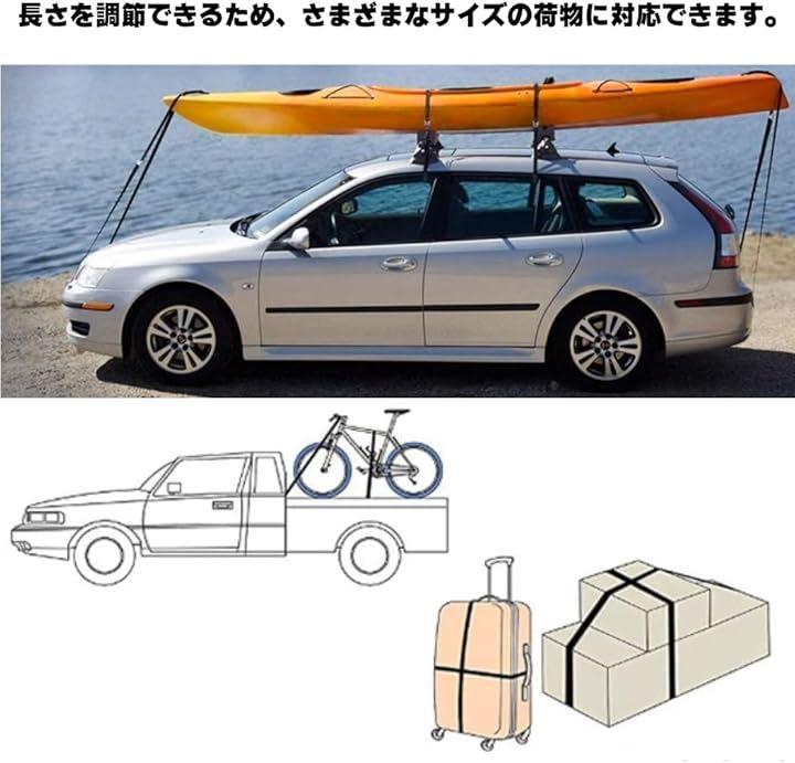 車のルーフキャリア用ベルト、キャンプ、アウトドア、自転車、サーフボード、クーラーボックス、家具固定まで幅広いシーンで活用できます。