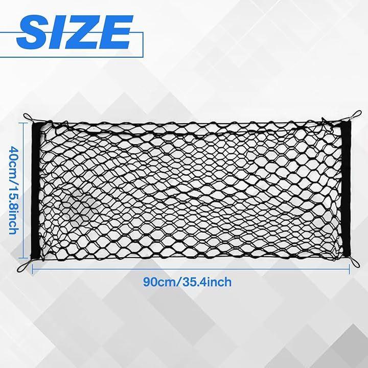 パッケージに含まれるもの:35.4インチ x 15.8インチ (90cm x 40cm) 2層トラックカーゴネット1個、フック4個、ネジ4個、ボタン4個
