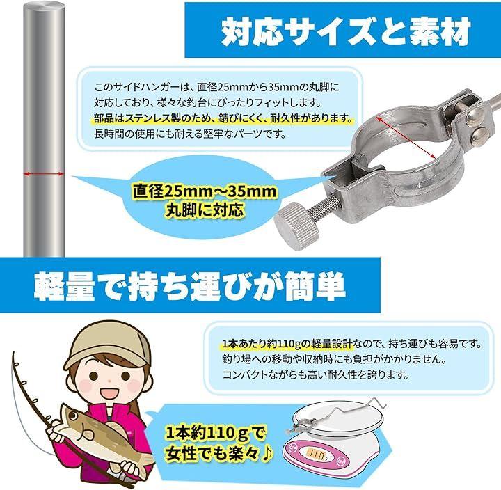 「対応サイズと素材」このサイドハンガーは、25mmから35mmの丸脚に対応しており、様々な釣台にぴったりフィットします。