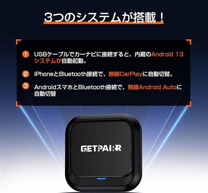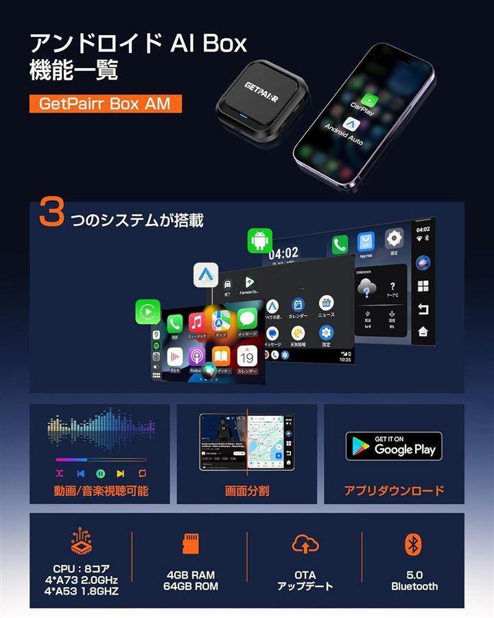 「Android 13.0搭載のGetPairr Box」本製品(AI Box)挿入するだけでカーナビがAndroidスマートフォン化。プリインスロールアプリの他、Google Playストアからアプリをインストールすれば、様々な動画配信サービスが利用できます。