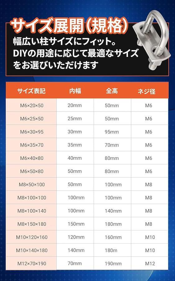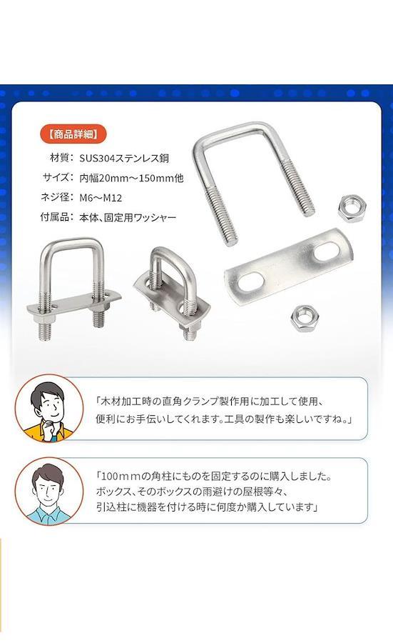 「仕様」サイズ:内幅20mm~150mm他 ネジ径:M6~M10他 材質:SUS304ステンレス鋼 付属品:本体、固定用ワッシャー