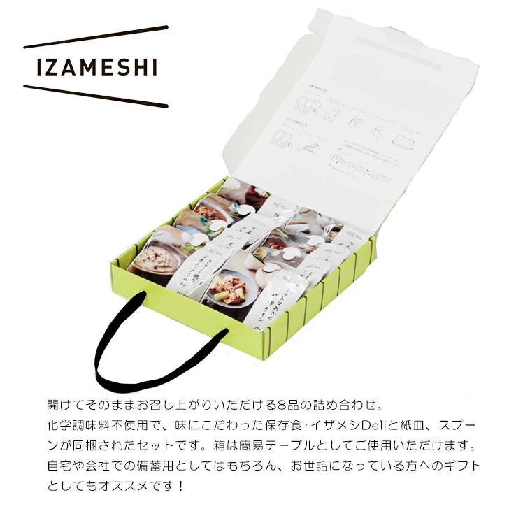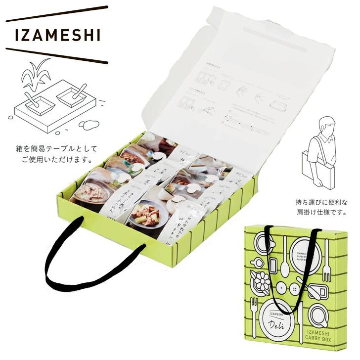 化学調味料不使用で、味にこだわった保存食・イザメシDeliと紙皿、スプーンが同梱されたセットです。箱は簡易テーブルとしてご使用いただけます。自宅や会社での備蓄用としてはもちろん、お世話になっている方へのギフトとしてもオススメです!