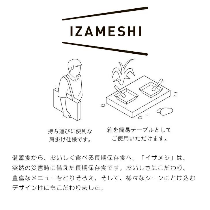 備蓄食から、おいしく食べる長期保存食へ。「イザメシ」は、突然の災害時に備えた長期保存食です。おいしさにこだわり、豊富なメニューをとりそろえ、そして、様々なシーンにとけ込むデザイン性にもこだわりました。