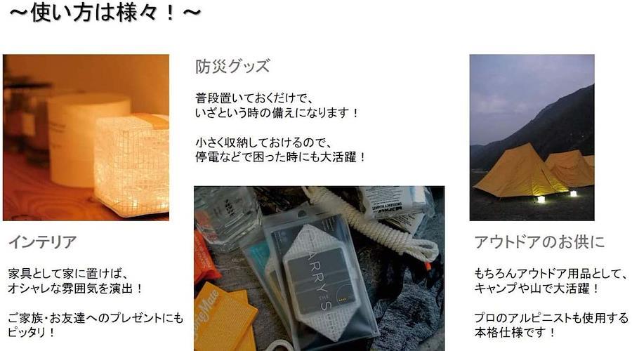 point4 使い方いろいろ、アウトドアから日常、非常時まで・プロのアルピニストも使用する本格仕様・日常の移動可能なインテリアライトして、常夜灯や玄関やお風呂で。・「ながら防災備品」として普段使いしながら「いざ」の停電の備えにもなります。・家族、親戚、知人へのギフトととしても喜ばれます。サイズ:88×88×88mm(使用時)、170×88×12mm(収納時)重量:57g仕様:LED6灯明るさ:強/30ルーメン、弱/15ルーメン、点滅モード点灯時間:10時間(強)、15時間(弱)