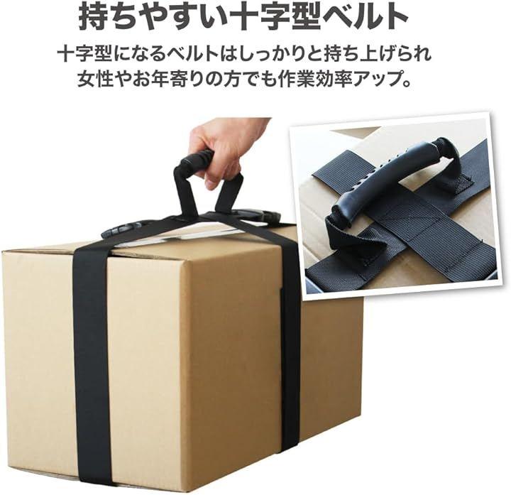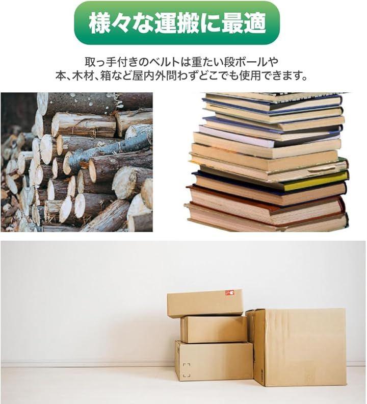 「持ちやすい十字型」取っ手付きのベルトは重たい段ボールや本、木材、箱など屋内外問わずどこでも使用できます。