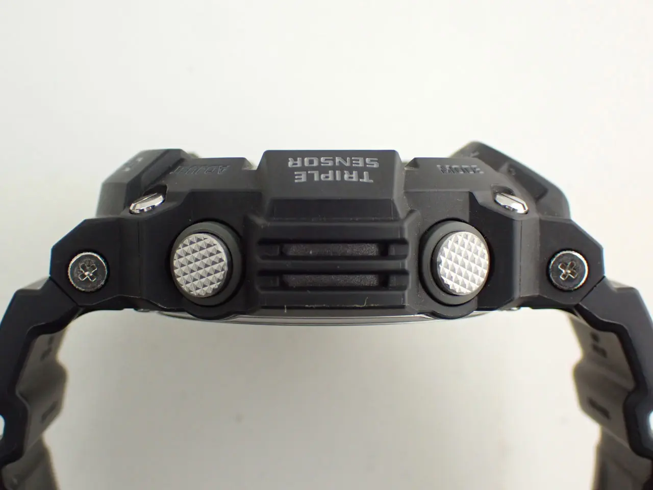 またG-SHOCK初のトリプルセンサー(高度・方位・気圧/温度)を搭載。気圧傾向グラフ、高度メモリー、方位補正機能などの計測機能も充実。その他に1/100秒のストップウォッチ、タイマー、5本のアラーム、パワーセービング機能など多機能を備えています。