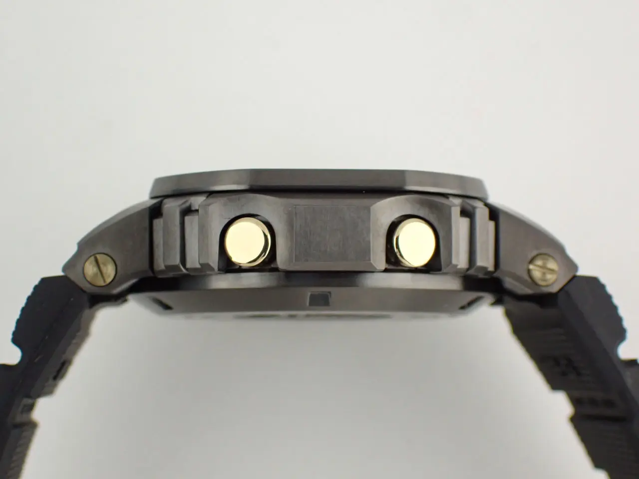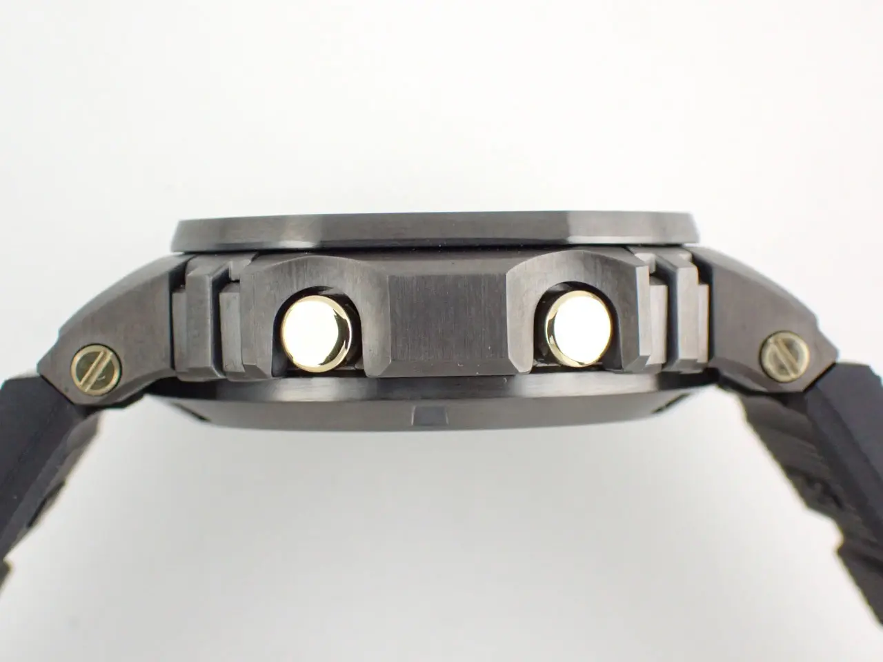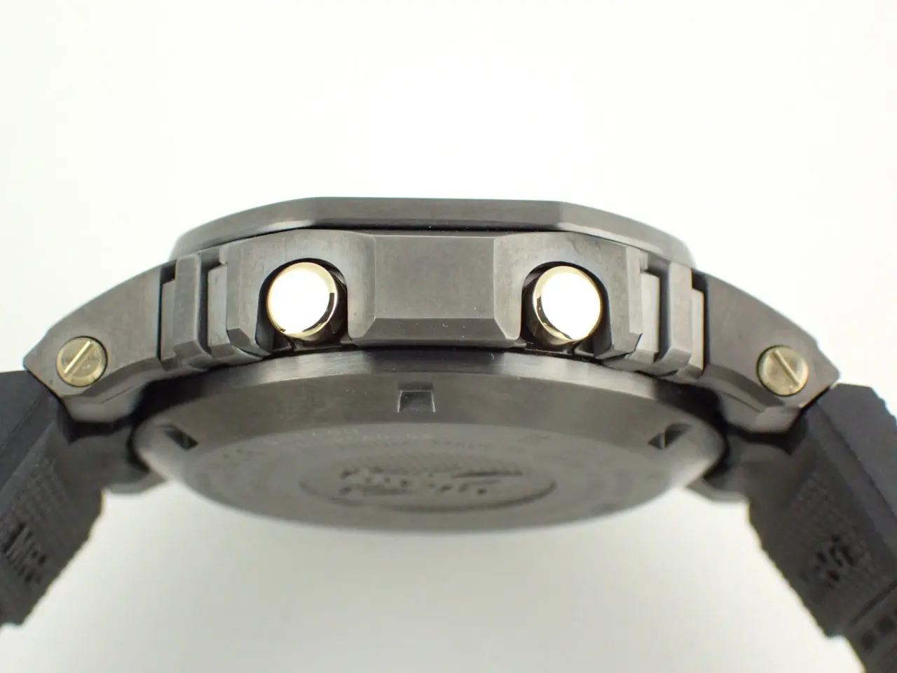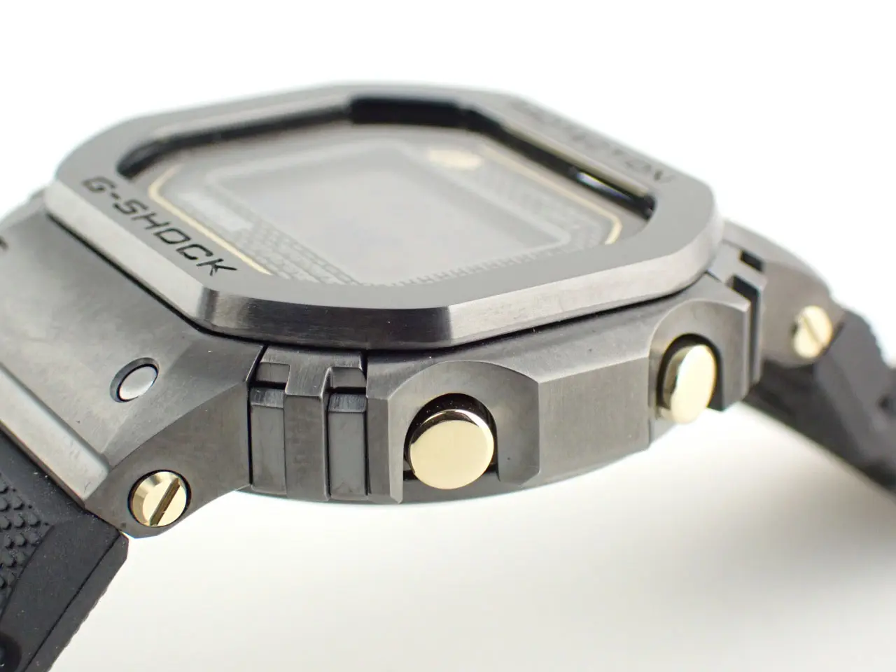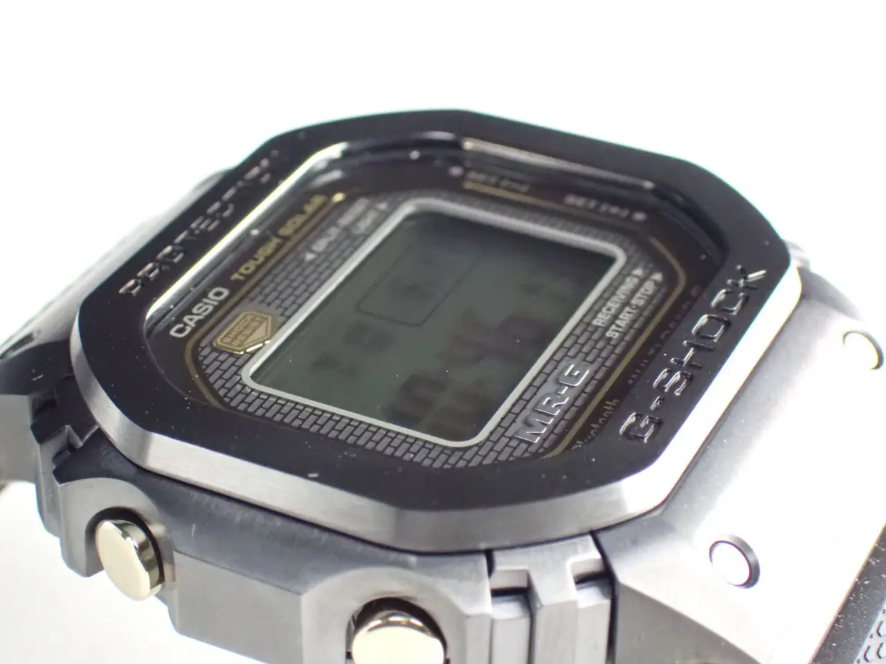 こちらの時計は、Gショックの最上位ライン「MRG」。初代モデルDW-5000Cの外観はそのままに、より現代に相応しいスペックと外観で登場しました。ベゼルトップにはコバルト合金の「コバリオン」を採用。耐衝撃、耐摩耗性に優れ、チタンの更に4倍の硬度を持ちます。全体のブラックカラーに、所々あしらわれたゴールドが良いアクセントに。細かなパーツの磨き分けもこのモデルならでは。