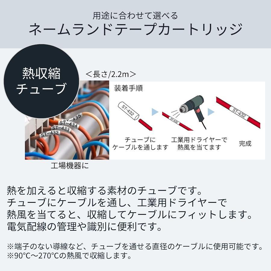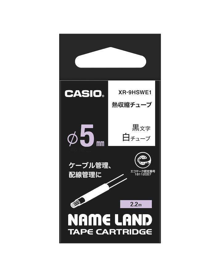 【テープ種類】熱収縮チューブ【チューブ径×長さ】φ5mm(φ2.5~φ5.0mm)×2.2m【タイプ】白に黒文字【用途】熱を加えると収縮する素材のテープ。チューブにケーブルを通し、工業用のドライヤーで熱風を当てると、収縮してケーブルにフィット。電気配線の管理の識別に便利。【ご注意】ネームランドの性能を維持し、安定してお使いいただくために、テープカートリッジは必ずカシオ純正品をご使用ください。カシオ製品以外のテープカートリッジをご使用になると、本体への悪影響や印刷品質の低下などネームランド本来の性能を発揮できない場合があります。カシオ製品以外のテープカートリッジのご使用に起因する不具合への対応については、保証期間内であっても責任を負いかねますのでご了承ください。【免責事項】メーカーによる商品リニューアルに伴いパッケージが変更が行われた場合、新パッケージでお届け致します事ご了承願います。