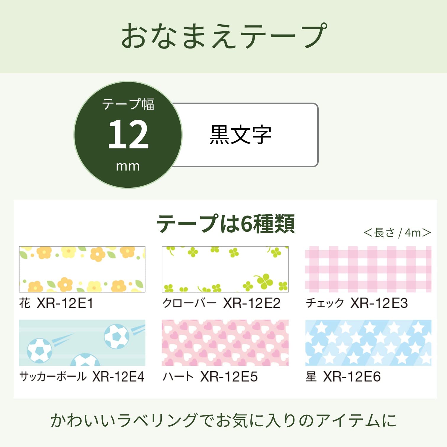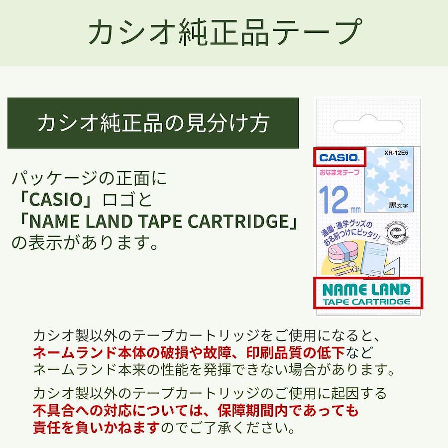 【テープ種類】おなまえテープ【テープ幅×長さ】12mm×4m【タイプ】星柄に黒文字【ご注意】ネームランドの性能を維持し、安定してお使いいただくために、テープカートリッジは必ずカシオ純正品をご使用ください。カシオ製品以外のテープカートリッジをご使用になると、本体への悪影響や印刷品質の低下などネームランド本来の性能を発揮できない場合があります。カシオ製品以外のテープカートリッジのご使用に起因する不具合への対応については、保証期間内であっても責任を負いかねますのでご了承ください。【免責事項】メーカーによる商品リニューアルに伴いパッケージが変更が行われた場合、新パッケージでお届け致します事ご了承願います。