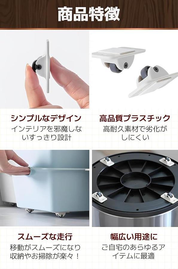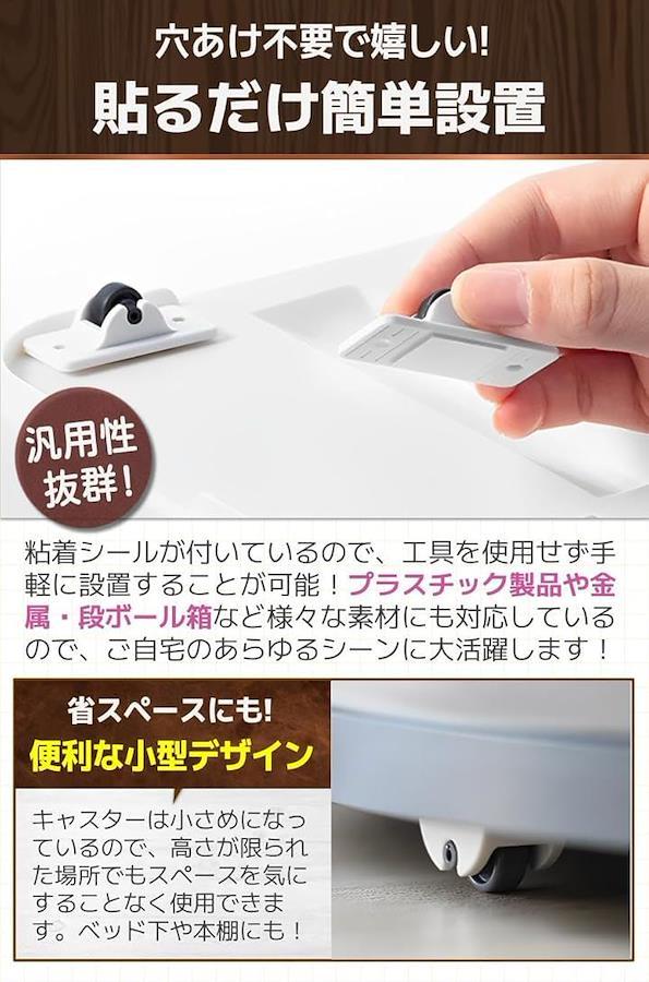 「ストレスなく楽々移動.」高耐久のプラスチック素材でスムーズな走行を実現し、ご自宅のあらゆるアイテムに設置するだけで取り出しや移動、お掃除などがとても楽になります。