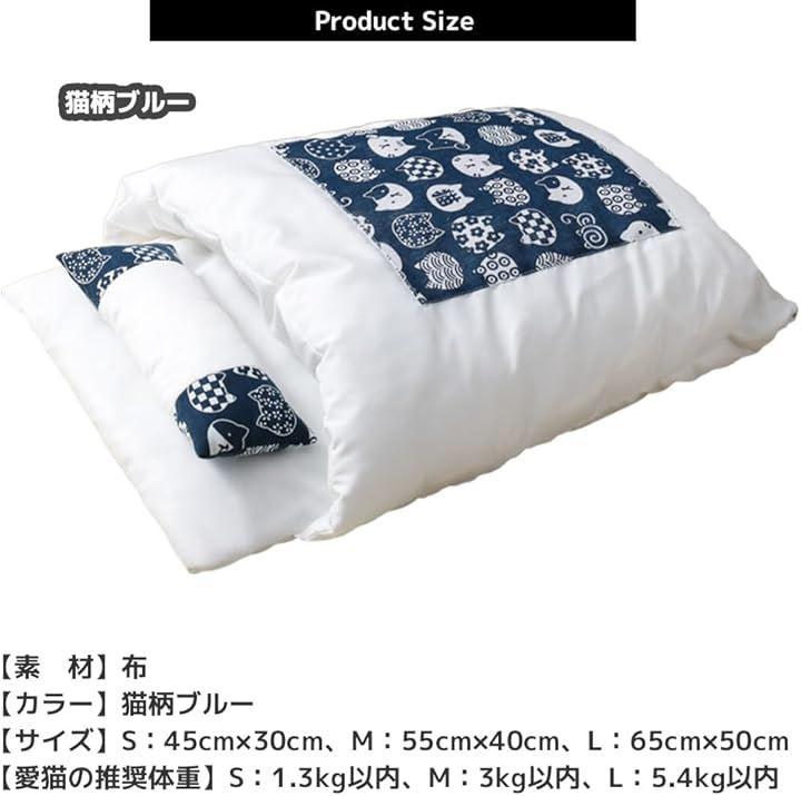 「素材」布「カラー 」猫柄ブルー「サイズ」S:45cmx30cm、M:55cmx40cm、L:65cmx50cm「愛猫の推奨体重」S:1.3kg以内、M:3kg以内、L:5.4kg以内