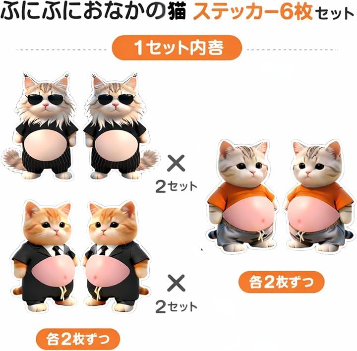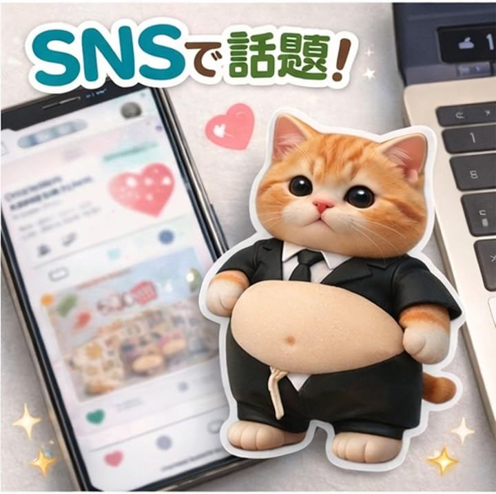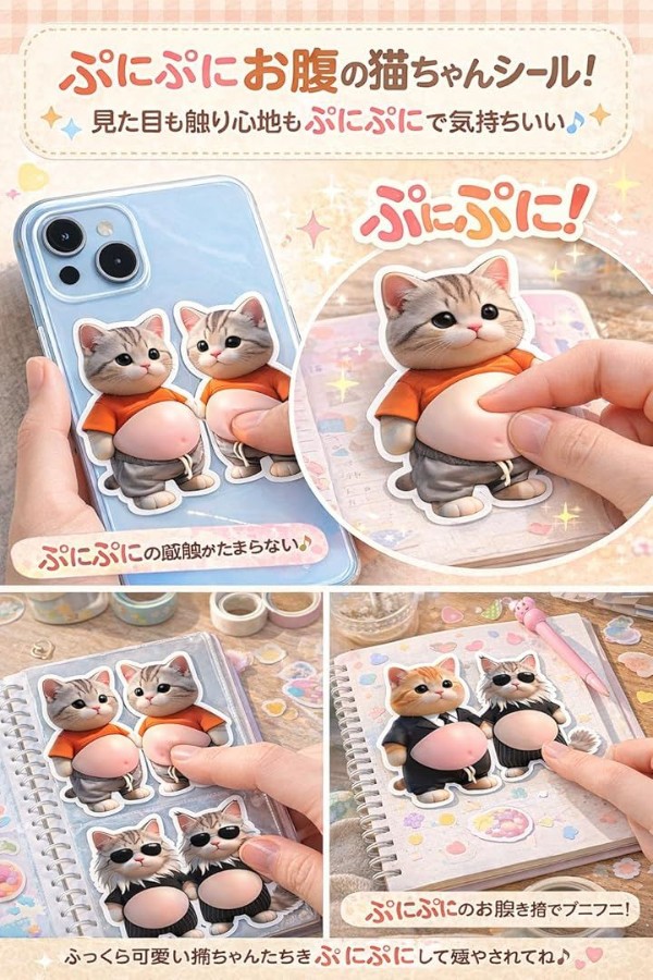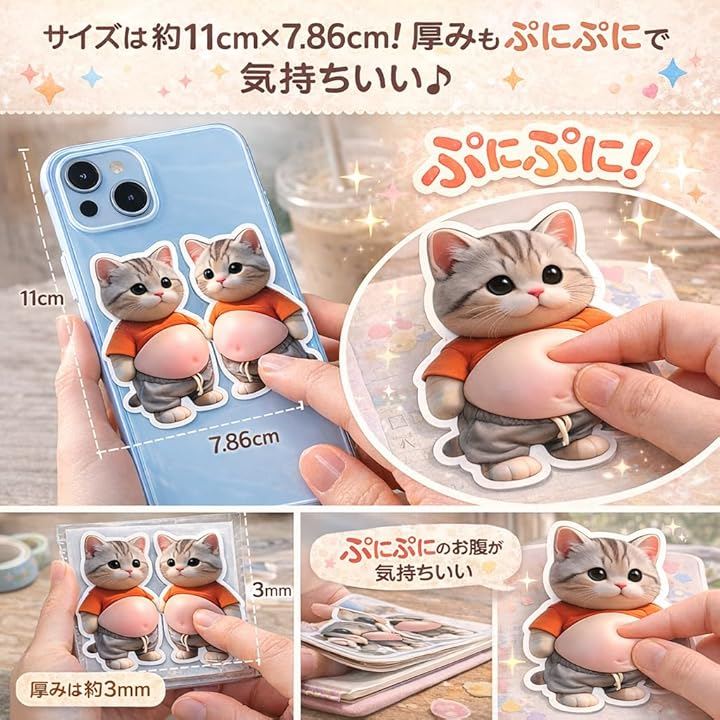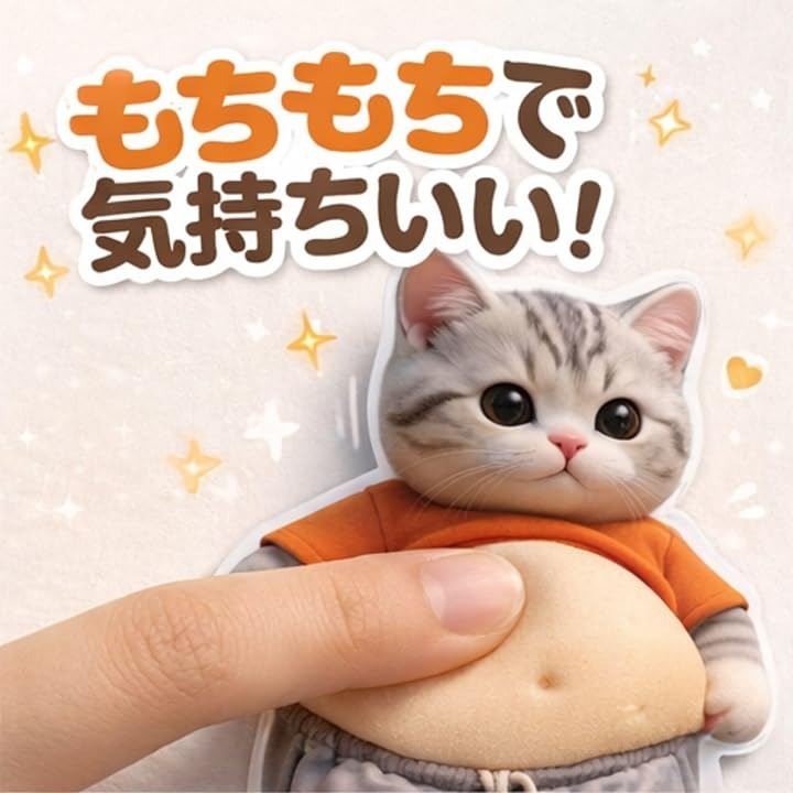 「3D立体構造xぷにぷく動作で極上の癒し体験」愛らしいデブ猫デザインに、リアルな存在感を生み出す3D立体構造を採用したお腹シール。