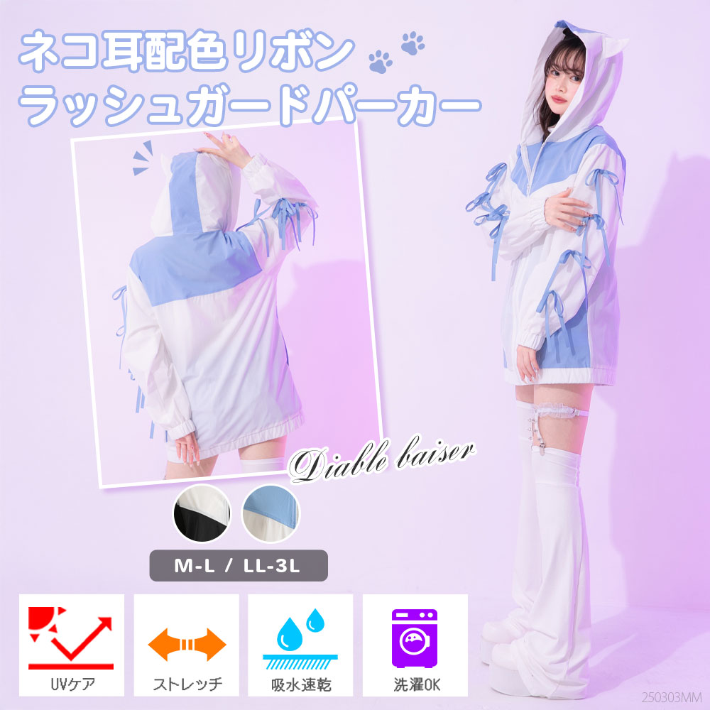 「病みかわ最強!ネコ耳付きラッシュガードパーカー」◇POINT◇ネコ耳付きフードで小悪魔感爆盛れ。体のラインをふんわり隠して、 細見え&儚げ感 アップ。フードかぶれば即あざとかわいいスタイル。濡れてもすぐ乾くから、海・プール・ライブ・フェスでも快適。配色デザイン/リボン配色もポイント。便利なポケット付きで携帯やコンパクト財布を入れれちゃいます。M-L/LL-3Lの2サイズ展開。----------【UVケア】紫外線から美肌守って、ストレスフリーにアゲ盛れ!【ストレッチ】ストレッチ機能って超アゲ!伸びる生地で 、めっちゃ動きやすい!【吸水速乾】汗かいても即サラ!ベタつき少なくずっと快適。【洗濯OK】ガンガン洗っても余裕!いつでも清潔&盛れキープ。※撥水加工・防水生地ではございませんので、着水は非推奨致します。----------【関連商品】4アイテム展開中535317:ネコ耳付ラッシュガードパーカー535318:ラッシュガードフリルパンツ535345:ウサギ耳フードラッシュガード535346:配色Aラインラッシュガード----------