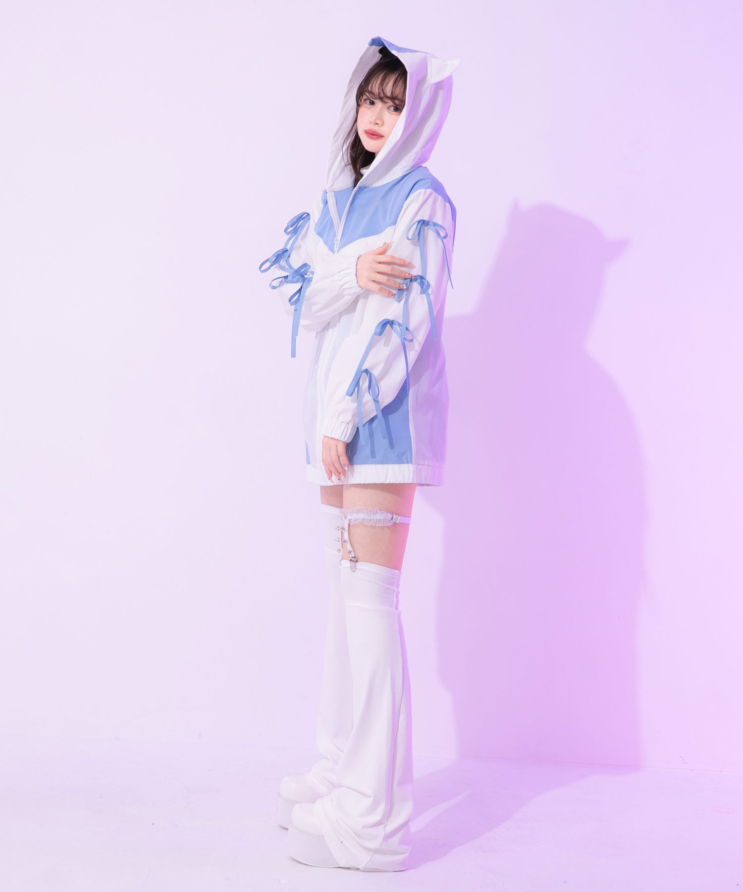 「病みかわ最強!ネコ耳付きラッシュガードパーカー」◇POINT◇ネコ耳付きフードで小悪魔感爆盛れ。体のラインをふんわり隠して、 細見え&儚げ感 アップ。フードかぶれば即あざとかわいいスタイル。濡れてもすぐ乾くから、海・プール・ライブ・フェスでも快適。配色デザイン/リボン配色もポイント。便利なポケット付きで携帯やコンパクト財布を入れれちゃいます。M-L/LL-3Lの2サイズ展開。----------【UVケア】紫外線から美肌守って、ストレスフリーにアゲ盛れ!【ストレッチ】ストレッチ機能って超アゲ!伸びる生地で 、めっちゃ動きやすい!【吸水速乾】汗かいても即サラ!ベタつき少なくずっと快適。【洗濯OK】ガンガン洗っても余裕!いつでも清潔&盛れキープ。※撥水加工・防水生地ではございませんので、着水は非推奨致します。----------【関連商品】4アイテム展開中535317:ネコ耳付ラッシュガードパーカー535318:ラッシュガードフリルパンツ535345:ウサギ耳フードラッシュガード535346:配色Aラインラッシュガード----------