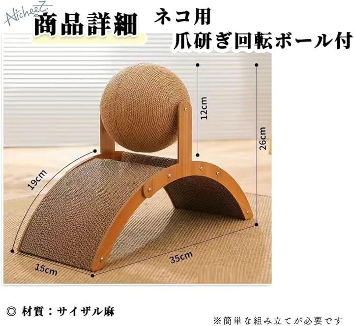 「商品内容」 ネコ用爪研ぎ回転ボール付 材質:サイザル麻 サイズ:横/約15cm 縦/約35cm 高さ/約26cm ボール直径/約12cm ハッピーパウダー付き *簡単な組立が必要です。
