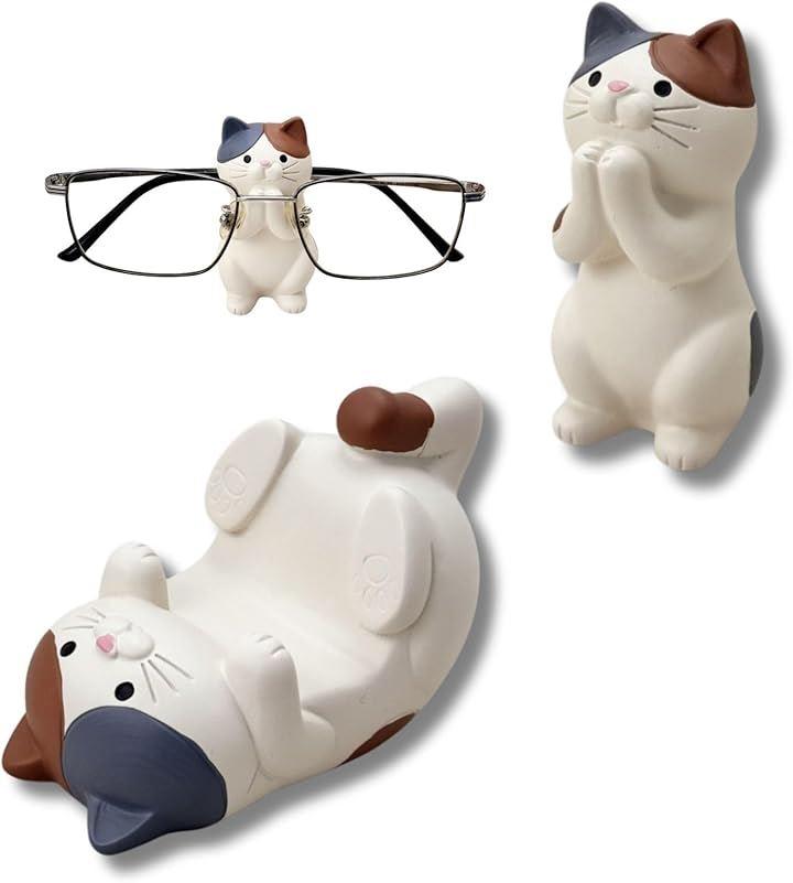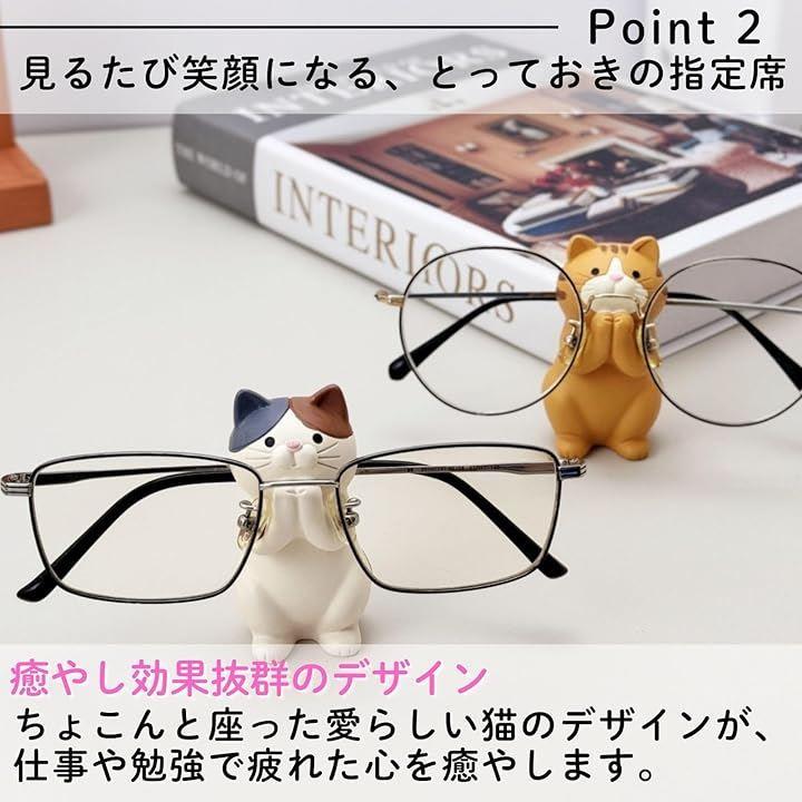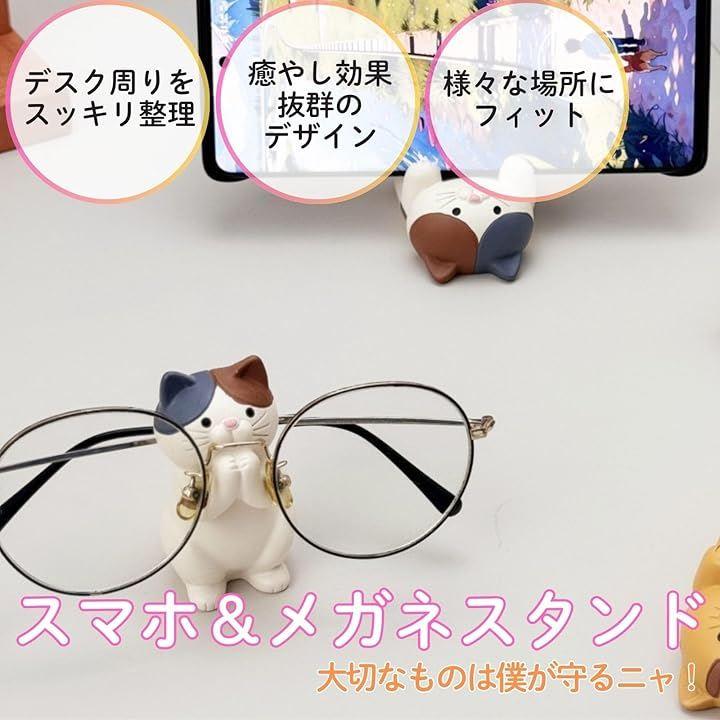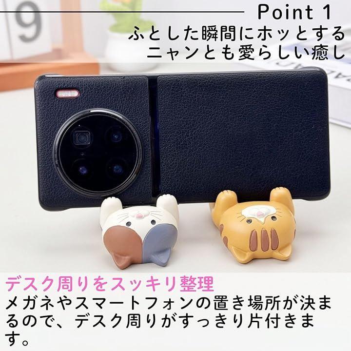 「癒やし効果抜群のデザイン」ちょこんと座った三毛猫とトラ猫がメガネやスマホを支える姿は、見ているだけで心が和みます。