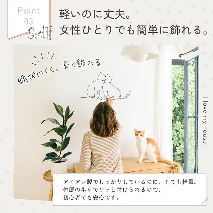 「商品詳細」*商品:アイアン製猫ウォールアート *バリエーション:手のひら猫(約29x23.5cm)、キスする猫(約20x40cm)、ハグする猫(約38x27cm) *素材:軽量アイアン *カラー:ブラック *特徴:軽量/錆びにくい加工/壁に馴染むモノトーンデザイン/取り付け用ネジ付き *用途:リビング・玄関・寝室・書斎・カフェ・ショップの壁装飾、猫好きの方への贈り物