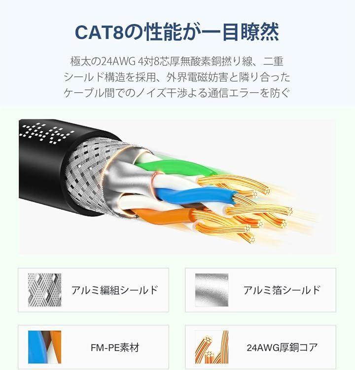「極厚二重シールド構造で混信除去」SFTPシールドで、従来のケーブルより遮蔽効果に優れており、内蔵100%マルチストランド無酸素銅線、4対8芯シールドケーブル、24AWGの導体、電磁妨害、ノイズ干渉を防止します。