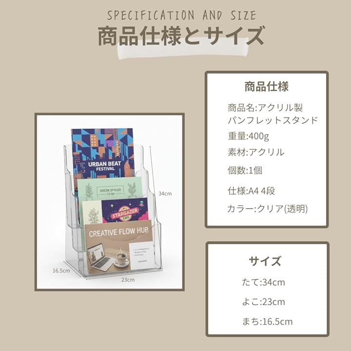 「商品仕様」商品名:アクリル製パンフレットスタンド 重量:400g 素材:アクリル 個数:1個 仕様:A4 4段 サイズ:縦34cm 横23cm まち16.5cm カラー:クリア(透明)