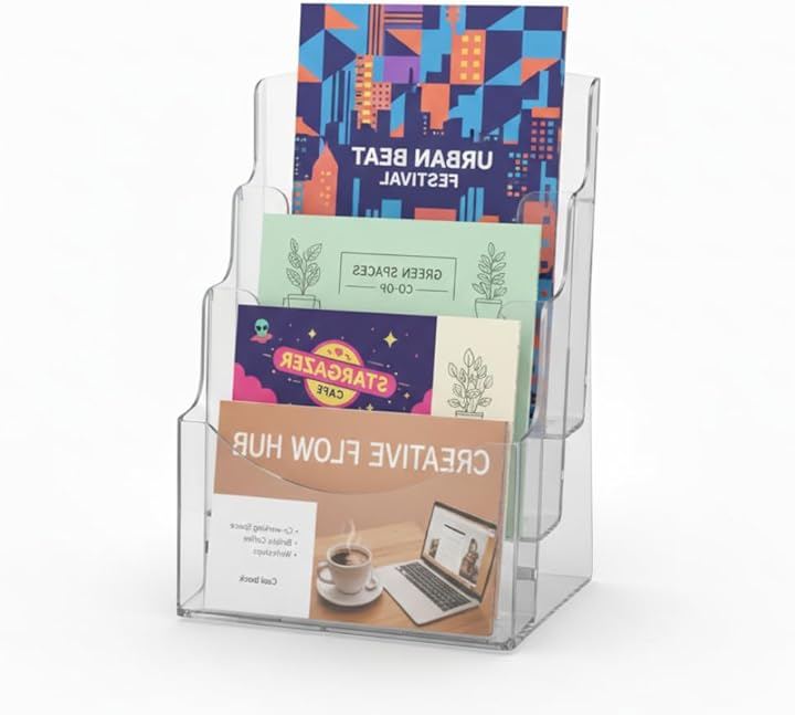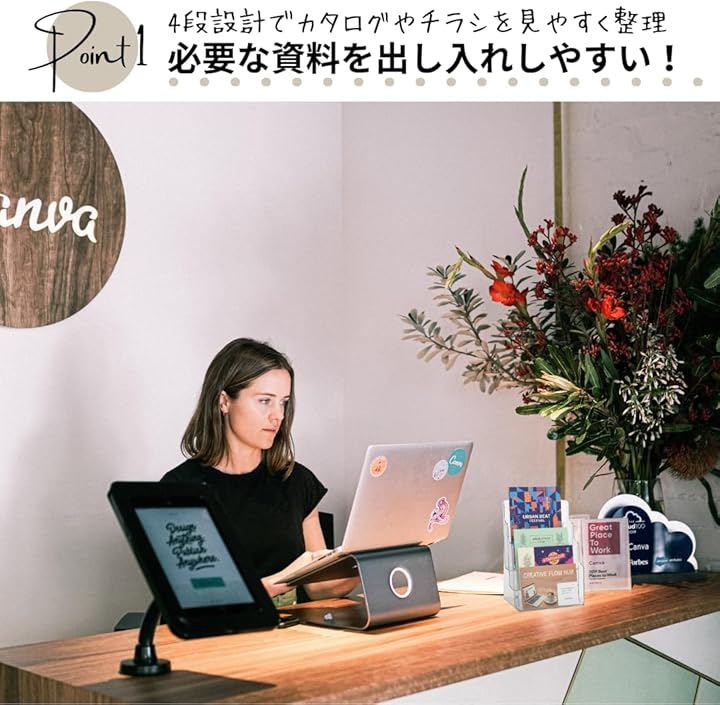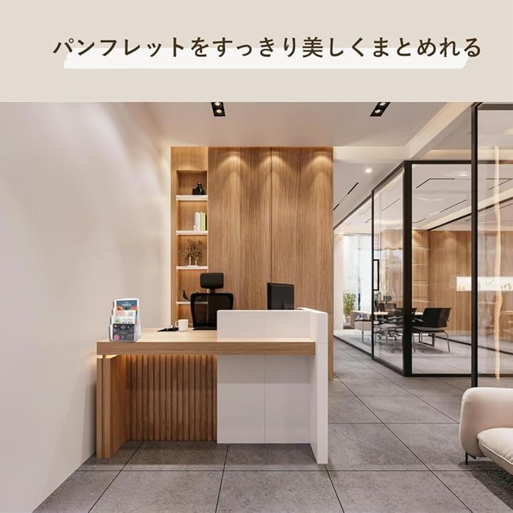 「たくさんのパンフレットを、すっきり美しくまとめたい」A4サイズ対応・縦型4段設計で、カタログやチラシを見やすく整理。