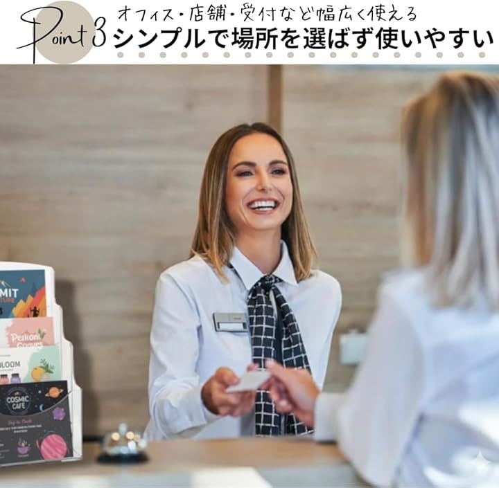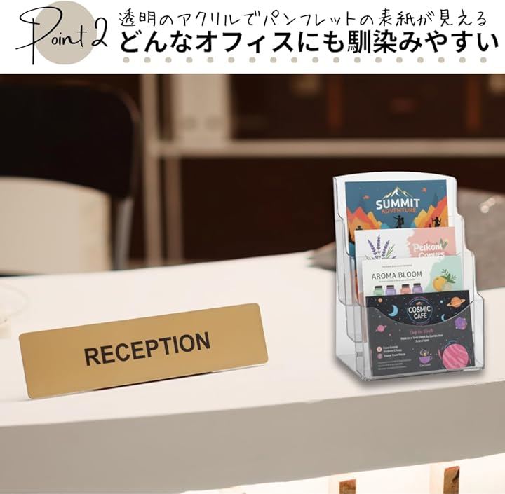 「中身が見えて、手に取りやすい設計」透明アクリル素材で、パンフレットの表紙が一目で分かる仕様。