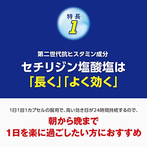 アレルギー性鼻炎用薬●1日1回1カプセルの服用で、高い効き目が24時間持続します。●抗ヒスタミン作用だけでなく抗アレルギー作用及び抗炎症作用を有するので、「今つらい症状」と「後からくる症状」の両方をケアします。 内容量:24カプセル
