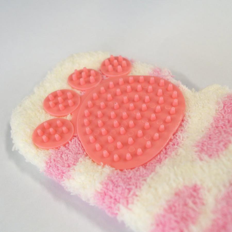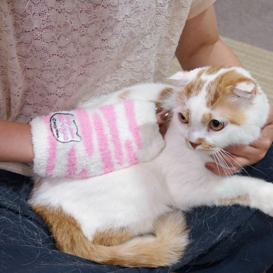 ・右手にはねて使うミトンタイプの猫撫でブラシ。指先は出せるので便利。