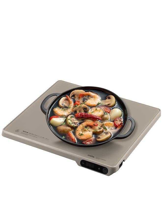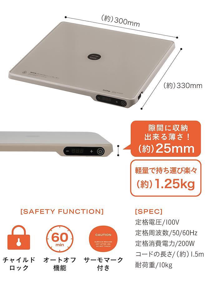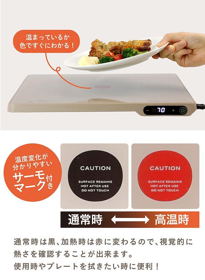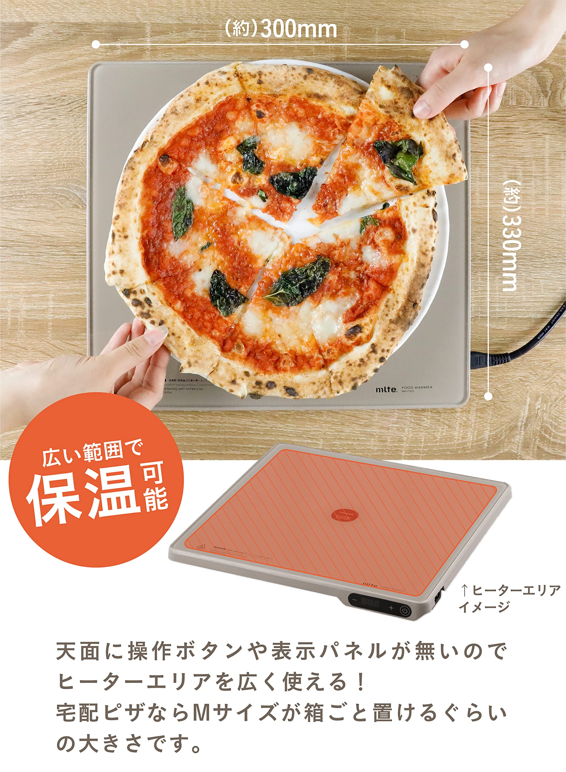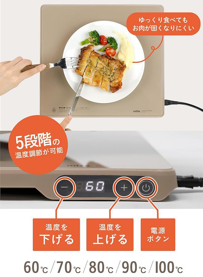 3営業日以内に発送≪新品未開封品≫:持ち帰った料理や作りたての料理を食べていると、気が付いたときには料理が冷めきってしまっていることありませんか?そんなお悩みを解決してくれる、出来立ての温かさが続く、ずっと美味しい時間が続く「mlteフードウォーマー」本体に料理を載せて温度を設定するだけ。最後の一口を食べきるまで、様々な料理や飲み物を保温してくれます。買ったお弁当も、容器に入ったまま温められます。晩酌のお供を保温するのにもオススメです。天面に操作ボタンや表示パネルが無いので、ヒーターエリアを広く使えて便利。温度変化が分かりやすいサーモマーク付きなので安心。
