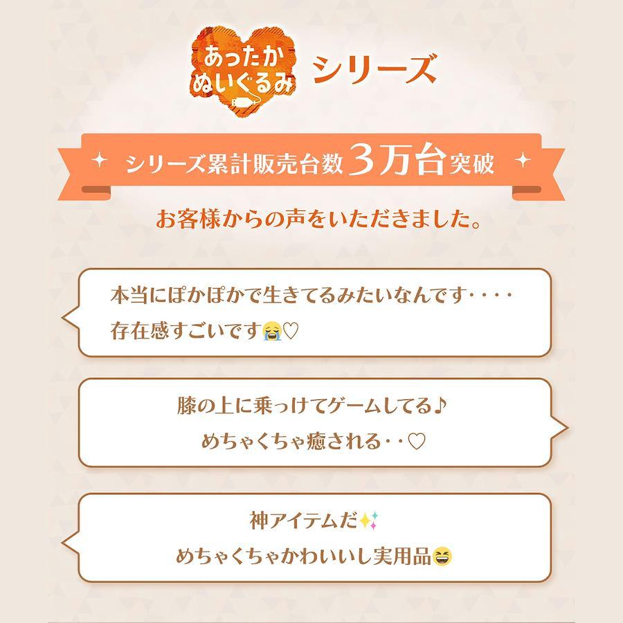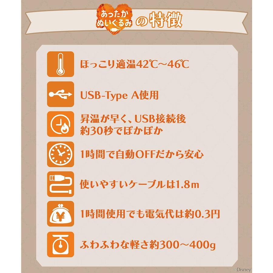 【あったかぬいぐるみの特徴】・ほっこり適温42℃~46℃・USB-Type A使用・昇温が早く、USB接続後約30秒でぽかぽか♪・1時間で自動OFFだから安心!・ふわふわな軽さ♪約300~400g・ケーブルの長さは1.8m・1時間使用でも電気代は約0.3円・「グラフェンヒーター」を使用安全性が高くやわらかいカーボン樹脂ヒーターです