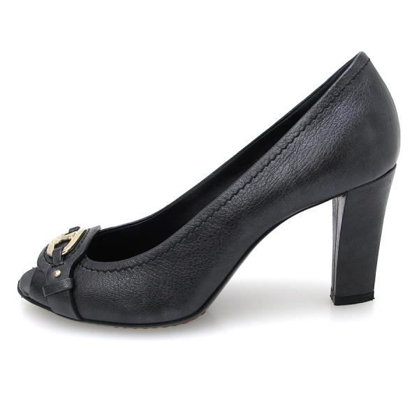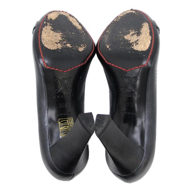■採寸#35 1/2 日本サイズ:約22.5cm 甲幅7.5cm ヒール高さ7.5cm ■素材表記なしセリーヌからパンプスが入荷しました。黒のレザーとゴールドの金具が上品で高級感溢れる一足☆☆オープントゥで素敵なデザインです◎甲金具くすみ、ヒールゴムスレ、外履き感、わずかにレザースレもありますがあまり気になら無い程度です。
