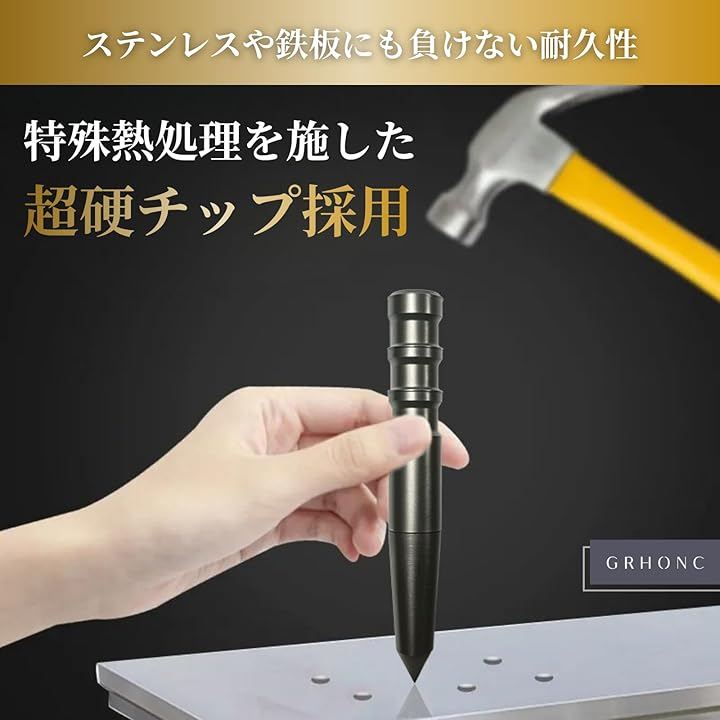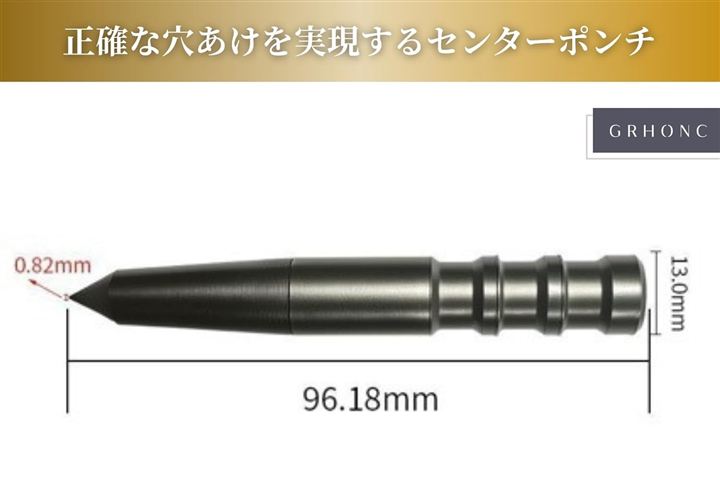 「年間3,400個出荷。正確な穴あけを実現する高精度センターポンチ」ドリルの刃が滑りやすい金属やタイル、木材の表面に、ハンマーで叩くだけでしっかりくぼみを作ります。