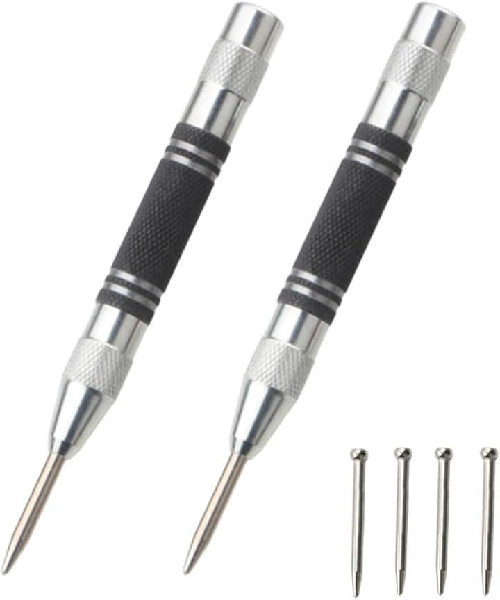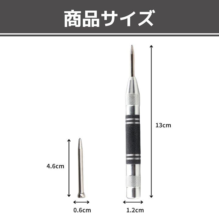 「商品詳細」サイズ:自動ポンチ 長さ13cmx幅1.2cm、センターパンチ先端 長さ4.6cmx幅0.6cm 重量:90g 材質:高速度鋼 色:シルバー 個数:2個セット