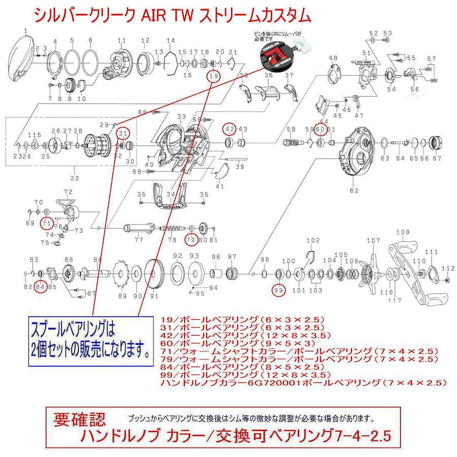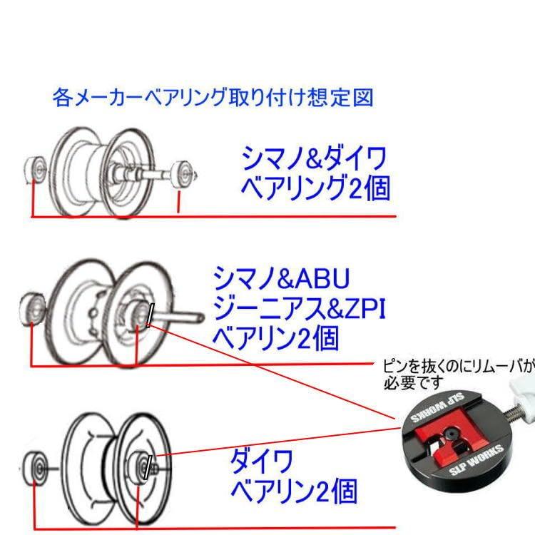 ギア比、左右ではベアリングサイズは変わりません。 ベアリング説明 ◎ステンレスベアリングシールドグリス入り ABEC11仕様の滑らかなベアリングです ◎ HXセラミックベアリング オープン(販売時オイルレス) 何面格でセラミックベアリングス門に最適、オープンタイプなのでメンテナンスも楽になります(ABEC11仕様) ◎GXセラミックベアリングGX シールドタイプ(一部オープン有り)(販売時オイルレス) セラミックベアリングには珍しい シールドベアリングになります。 シールドベアリングなのでゴミ、異物が入りにくくなります。 (ABEC11仕様) ◎ジルコニアセラミックベアリング (販売時オイル無い) ソルト使用には絶対必要では無いでしょうか、錆びないのが最大のメリット 外輪セラミック、内輪セラミック ポールセラミック、保持器に特殊素材使用でベアリングノイズをできるかぎ軽減 ◎タイプSセラミックベアリング (販売時オイル無し)HX-TYPES タイプS特有の保持器によりオイルレス、オイルイン共に滑らかさ、低ノイズに優れてます (ABEC11仕様) ◎セラミックベアリングHXR (販売時オイルレス) 特殊保持器により 耐久性、飛距離、高回転、低ノイズでとても優れてます もちろんオイルレス、オイルインでの使用も可能 (ABEC11仕様) ツインベアリング(ダブルボールベアリング)は各種ベアリングの特性いかし 制作した物で初速が良くなってます。 通常ベアリングよりさらに軽量ルアーキャストの可能が可能 取り付け 通常、ベアリングの厚みが4mmですがツインベアリングは厚みが3mmのためリングで厚みを1mm増やします 取り付け方は簡単です。パーミングカップ側とキャスコン取付時は リール本体とベアリングの間にoリング大を入れてください。 スプールにベアリングが付いてる機種は小さいoリングを使います 通常、ベアリングの厚みが4mmですがツインベアリングは厚みが3mmのためoリングで厚みを1mm増やします 取り付け方はスプールシャフトにoリングを入れてベアリングのボールが 自分に見える側にして入れます。