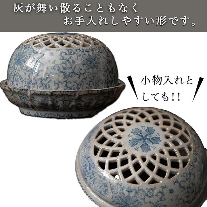 陶器の高級感と丸いフォルムが魅力。陶磁器の美しい釉下青白が特徴の蓋つき丸香炉です。