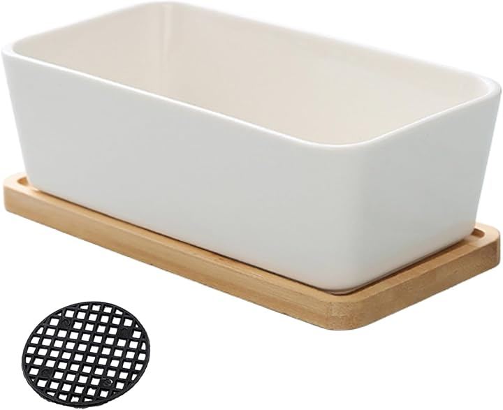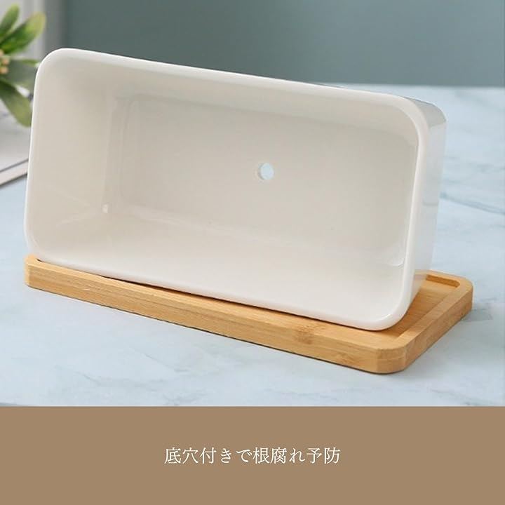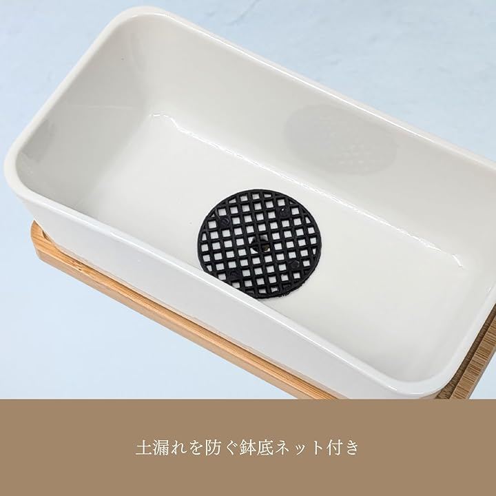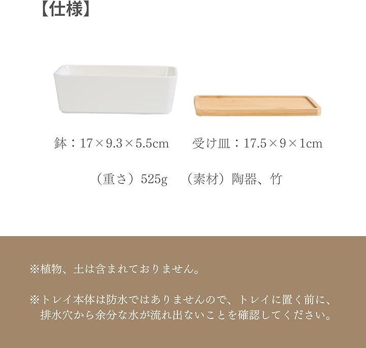 「仕様」(セット内容)鉢、受け皿、鉢底ネット (サイズ)鉢:17x9.3x5.5cm、受け皿:17.5x9x1cm (重さ)525g (素材)陶器、竹 *植物、土は含まれておりません。