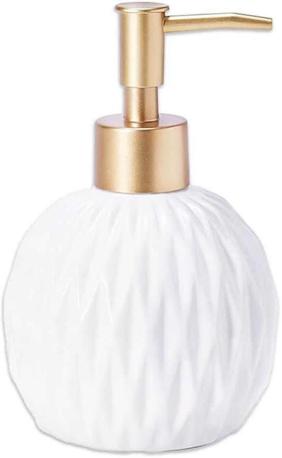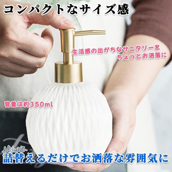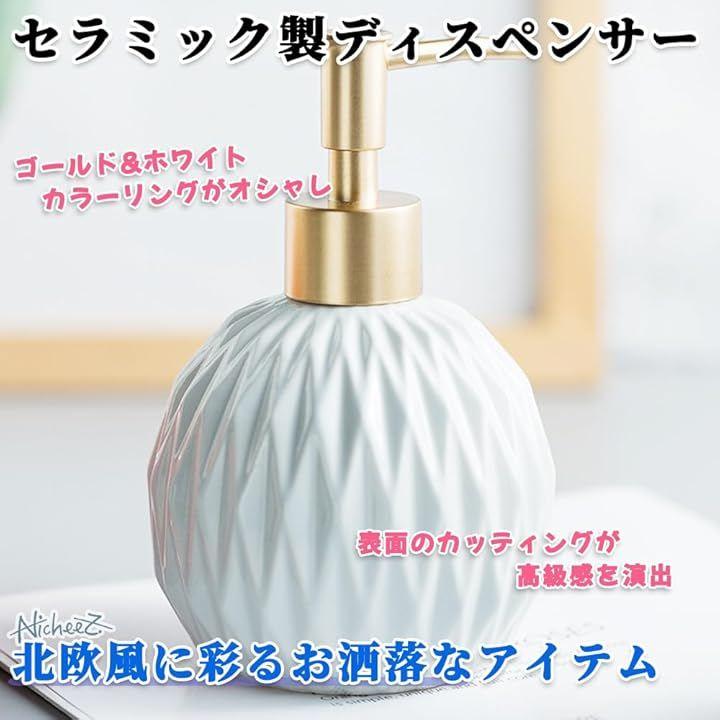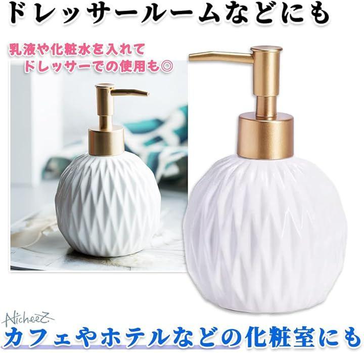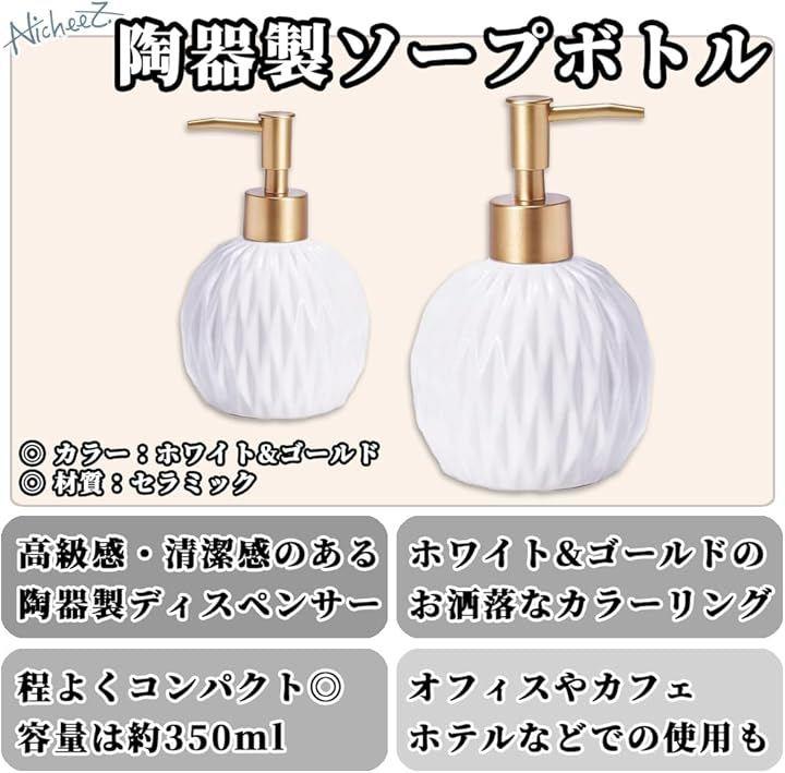 「商品内容」 陶器製ソープボトル 材質:セラミック カラー:ホワイト&ゴールド サイズ:幅/約9cm 高さ/約15cm 容量:約350ml