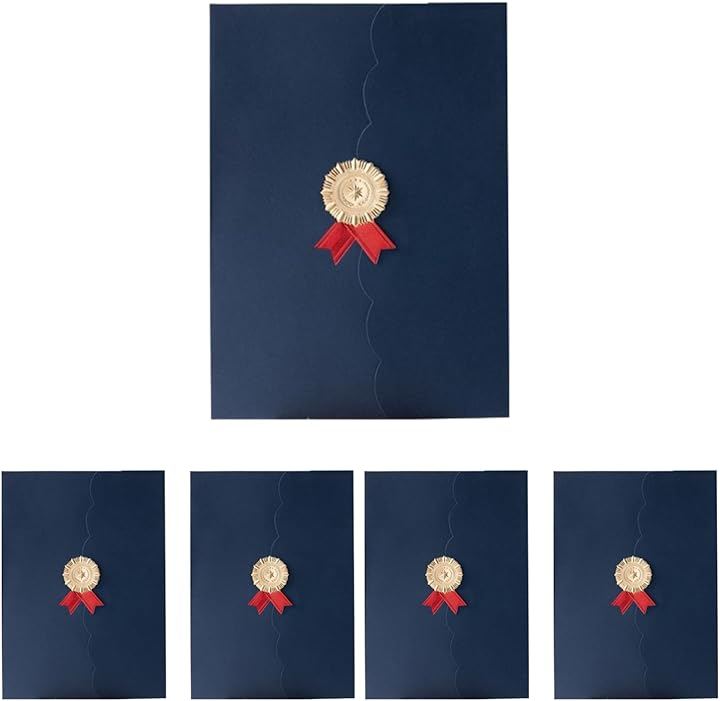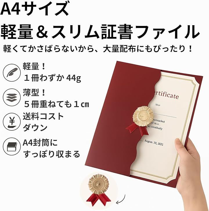 デザイン性: 金のエンブレムと赤いリボンが付いた高級感のある証書ファイル。