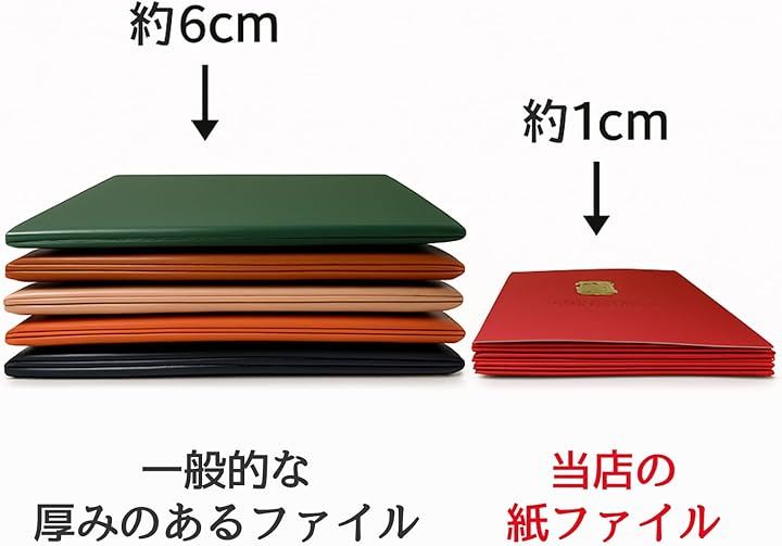 収納性能: 薄型設計により5冊重ねても約1cmの厚さで、保管時も場所を取らずコンパクトに収納可能