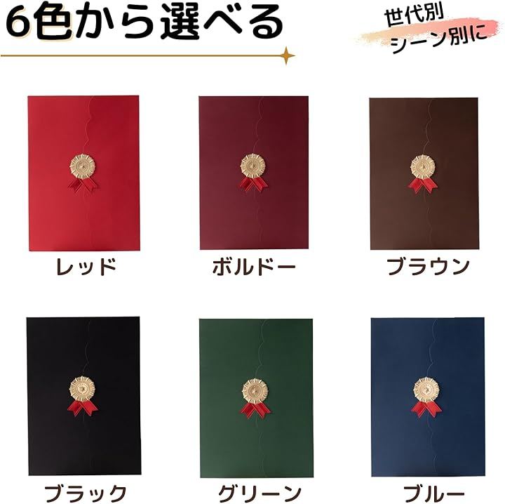 黒、茶、赤、ボルドー、紺、緑の6色展開で、様々な用途やイメージに合わせて選べます。
