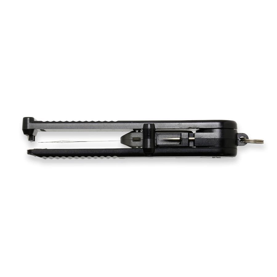 スレッダーホルダー付属の、刃の交換ができるラインクリッパーです。刃を受ける部分にアルミプレートが追加され、より切れ味鋭いラインクリッパーへと進化しました。マグネットで保持されている刃は簡単に交換できるので、いつでも鋭い切れ味でお使いいただけます。クリッパー内部にはスレッダーホルダーが内蔵され、収納されているアイクリーナーとスレッダーは、光量が少ない時間帯のフライ交換に役立ちます。クリッパー表面のマグネットは、フライキャッチャーとしてお使いください。●スリーインワンクリッパーは使用頻度の高いクリッパー、スレッダー、アイクリーナーをひとつにまとめた、ユニークなアクセサリーです。●スレッダーを使用する時は、図のように本体からスレッダーを引き出して使用してください。スレッダーは取り外しができます。●スタンダード、ミッジサイズのショートスレッダー各1本とスペアーブレード3枚付き。●クリッパーの刃はマグネットの磁力で保持しています。