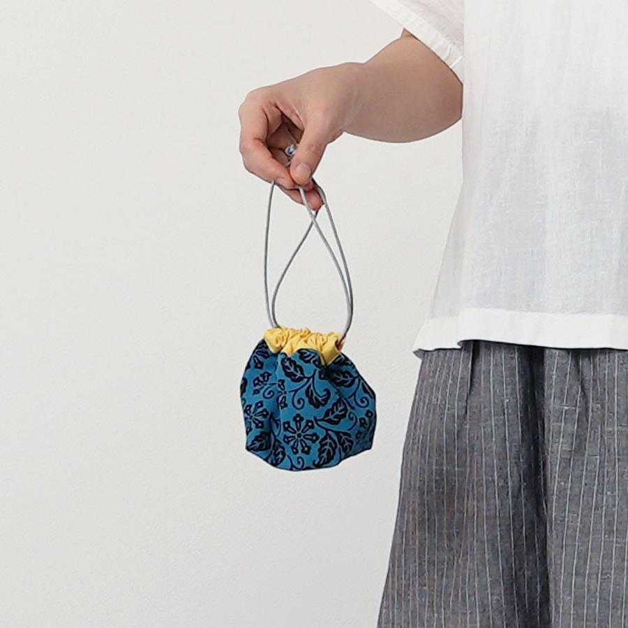 【丁子唐草】平安時代から薬用・香料・染料として珍重された「丁子(クローブ)」と、子孫繁栄や長寿を願う「唐草(蔓草)」を組み合わせた、どこかレトロで上品な柄です。ころんと愛らしいサイズ感で、小物の整理やちょっとしたお出かけにぴったりな巾着袋です。